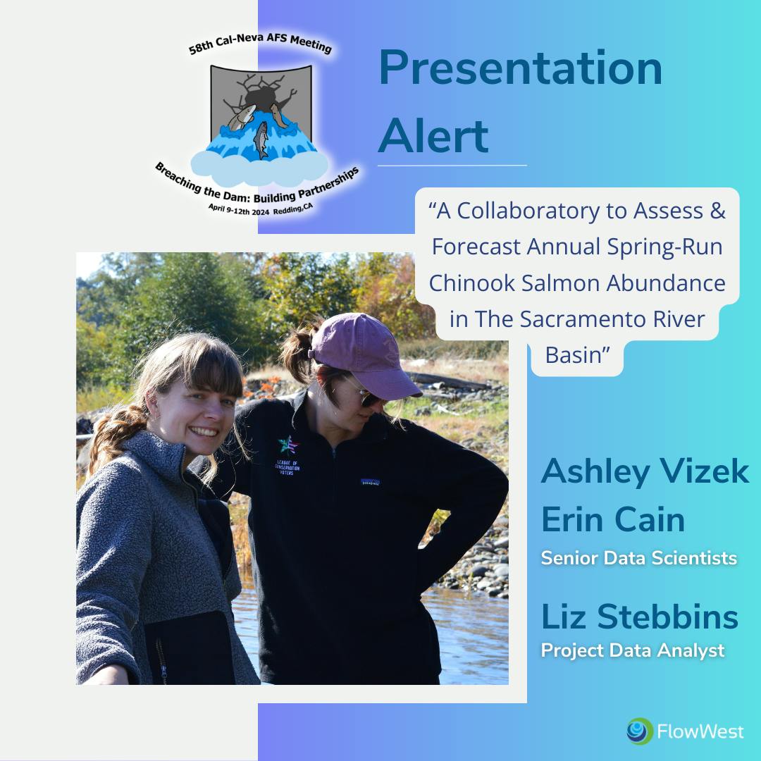 Ashley Vizek, Erin Cain, and Liz Stebbins will be presenting at the conference in the spring run Chinook juvenile production estimate (SR JPE) symposium titled “A Collaboration to Assess and Forecast Annual Spring-Run Chinook Salmon Abundance in The Sacramento River Basin: Making, Managing, and Modeling Data Across Life Stages, Geographies, and Agency Boundaries.” FlowWest has been working on the SR JPE for the last few years in a data management and modeling support capacity. The symposium brings together the multiple agencies and scientists critical to the SR JPE project. Liz will be presenting her work synthesizing and documenting adult data across Central Valley spring run tributaries and the data’s utility in a novel prespawn mortality Bayesian model. Ashley and Erin will be discussing the human-centric approach to data management supporting the development of open and transparent data, tools, and models. The SR JPE is an exemplary cross-agency and multidisciplinary project that has led to development of resilient partnerships.