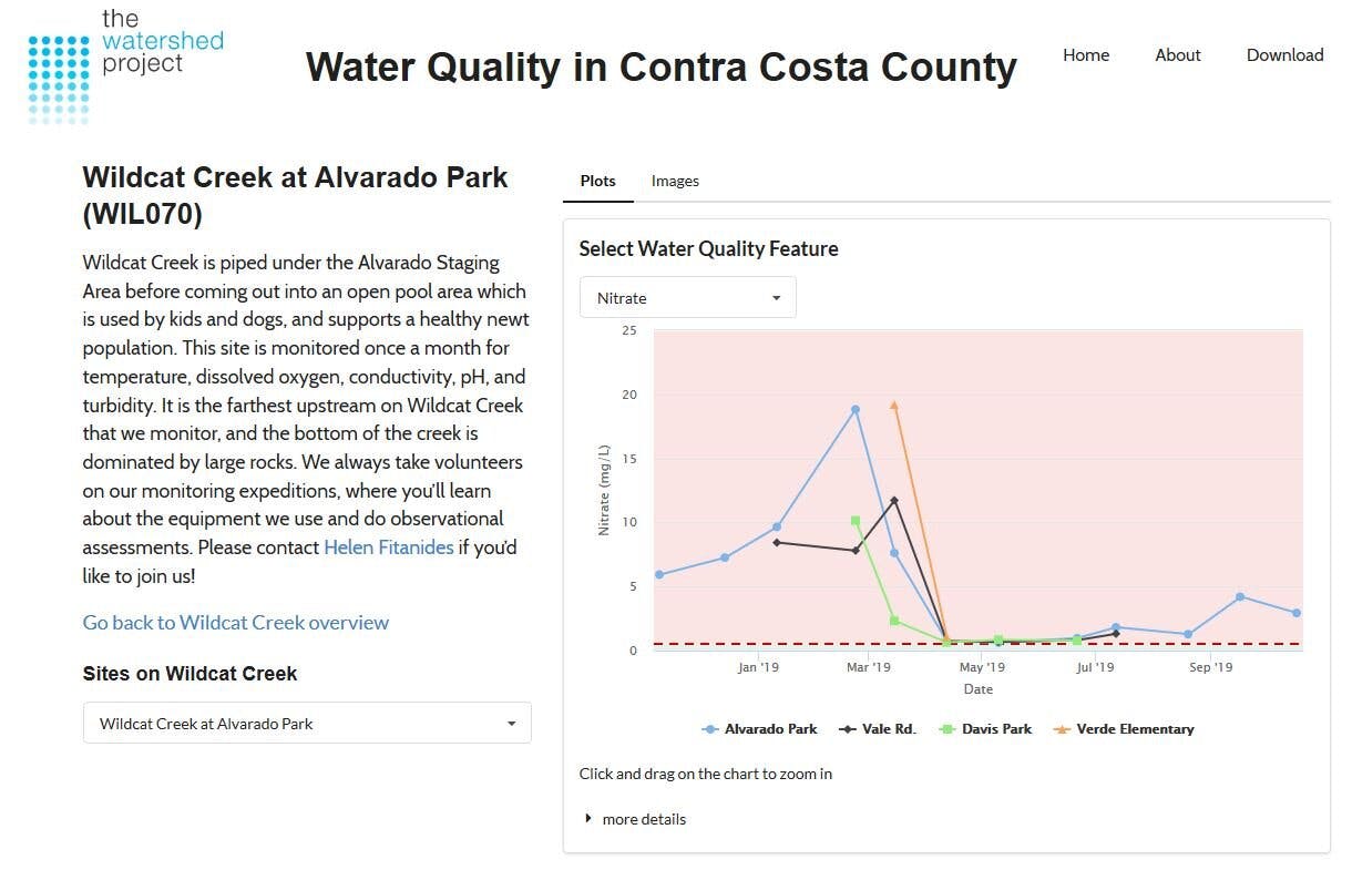 The Citizen Science Water Quality Web Application explains basic water quality concepts and provides a watershed scorecard so community members can quickly and easily assess their watershed’s water quality health. Users of the app can explore the water quality sampling sites within their watershed through interactive plots that illustrate each parameter and the safe thresholds. Armed with local water quality data, community organizers and watershed stewards can work with city, county, state, and federal agencies to implement restoration and urban greening projects to improve water quality conditions in their watersheds.