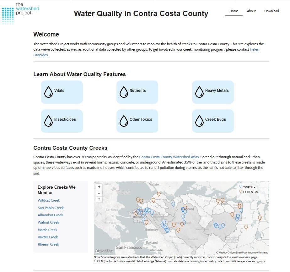 developer_modeApp DevelopmentdatabaseData ManagementFlowWest partnered with The Watershed Project (TWP) to develop a tool that helps local communities store, manage, and understand the data they collect in their local watershed. TWP supports grassroots watershed organizations and nurtures young people to aspire to environmental careers by engaging with students, teachers and volunteers directly in creek beds and on the shorelines. Based out of Richmond, CA since 1997, TWP is committed to building resiliency, community, and awareness in the Bay Area by bringing a watershed perspective to the urban environment.